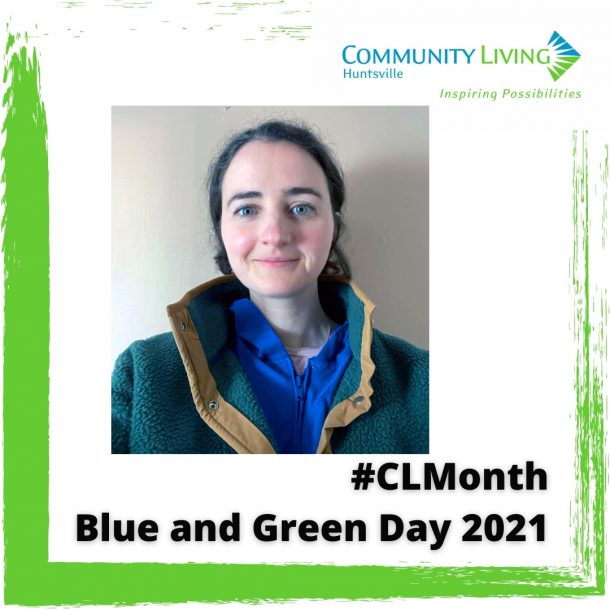 - Morgan Richter, manager for the Downtown Huntsville BIA and board member for Community Living Huntsville, shows her colours for Community Living Month’s Blue and Green Day in 2021!