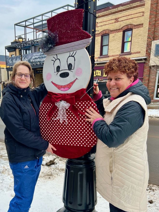 Ellen Selby (left), Interim Manager for the Downtown Huntsville BIA, and Jennifer Jerrett, Community Engagement Specialist for Community Living Huntsville, encourage community members and visitors alike to enjoy some winter cheer with the Festival of Frosties art installation in downtown Huntsville. Photo by Community Living Huntsville.