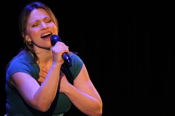 A woman with long blonde hair and a green T-shirt closes her eyes and sings passionately into a microphone held in her right hand.
