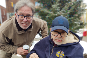2 smiling men, one standing, one seated in a wheelchair, both holding coffee cups.