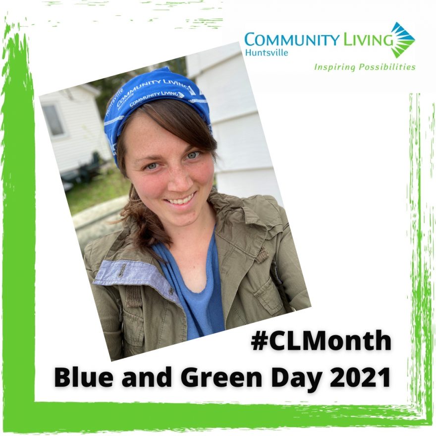 Morgan Richter, manager for the Downtown Huntsville BIA and board member for Community Living Huntsville, shows her colours for Community Living Month’s Blue and Green Day in 2021!