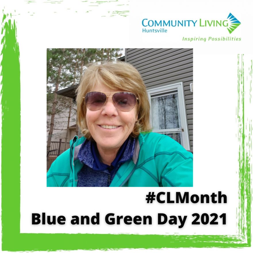 ← → Huntsville mayor Karin Terziano shows her colours for Community Living Month’s Blue and Green Day in 2021!