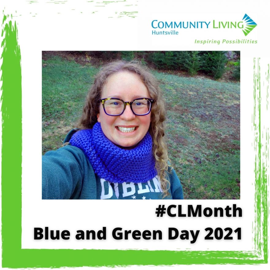 Amber McNair, youth services librarian for Huntsville Public Library, raises her selfie camera to join Community Living Month’s Blue and Green Day in 2021!