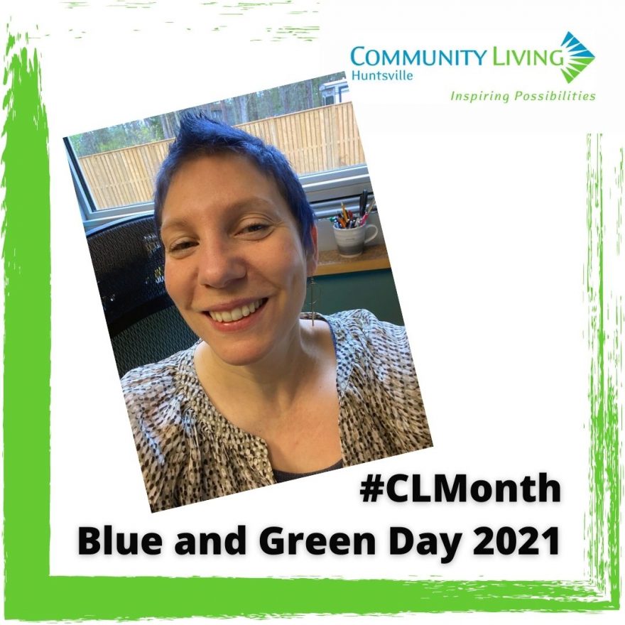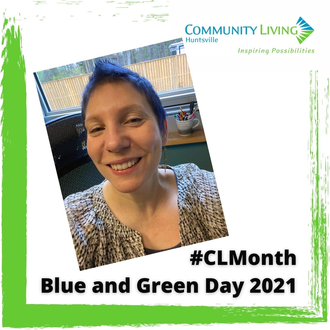 Talk about setting the bar! Community Living Huntsville executive director Suzanne Willett dyed her hair blue for Community Living Month’s Blue and Green Day in 2021!
